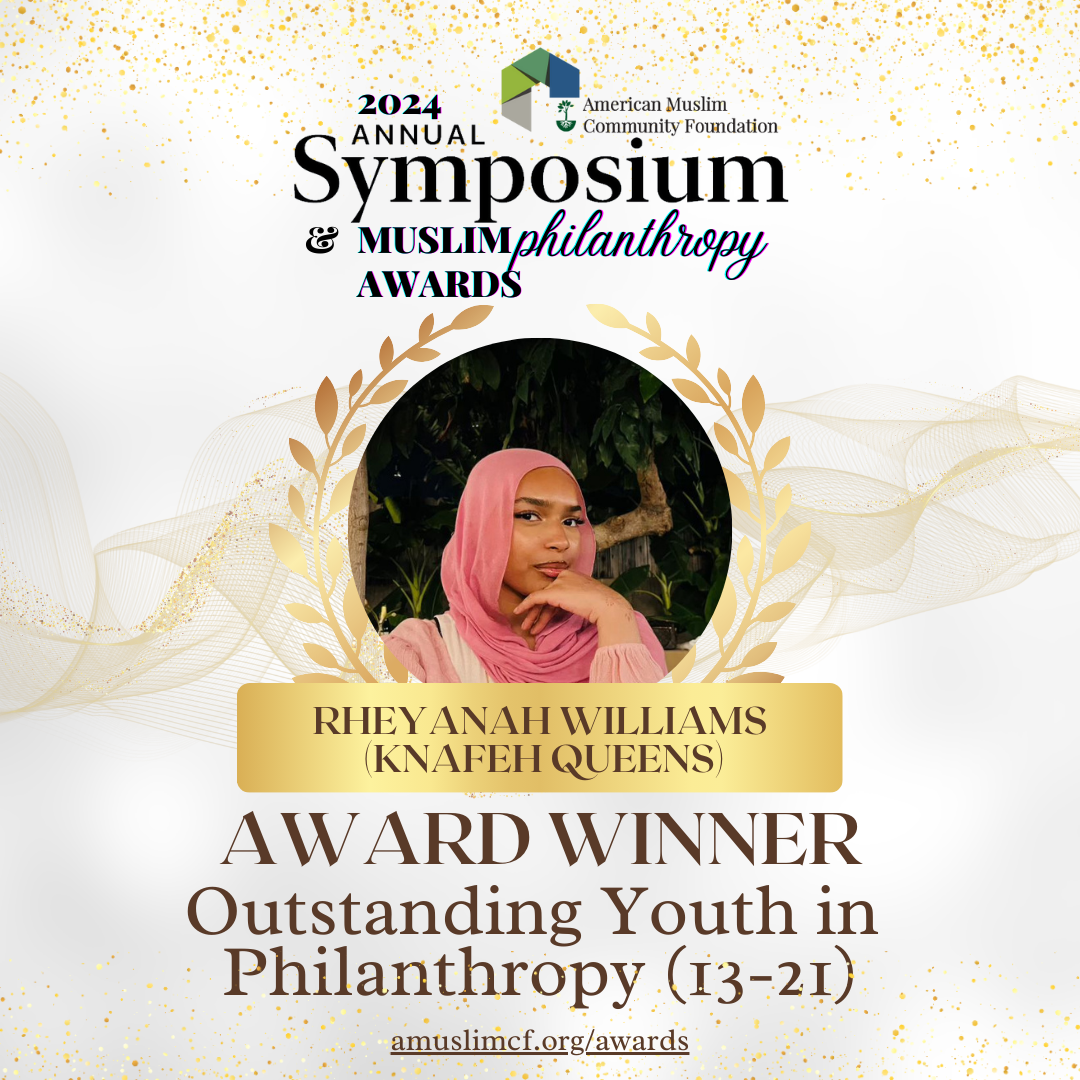 This award recognizes service by an individual or group ages 5–12 and 13-21 who demonstrates outstanding commitment to the community through direct financial support, development of charitable programs, volunteering and leadership in Muslim philanthropy. Nominees will be judged based on work done while they were 5–21 years old.