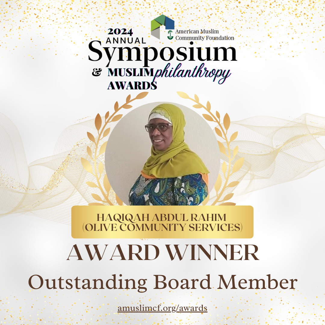 The Award for Outstanding Board Member honors an individual who demonstrates outstanding leadership as a cherished volunteer, dedicating their time towards promoting the organization, being a community advocate, and staunch supporter. The recipient must have demonstrated exceptional community leadership and service for a Muslim focused nonprofit organization.
